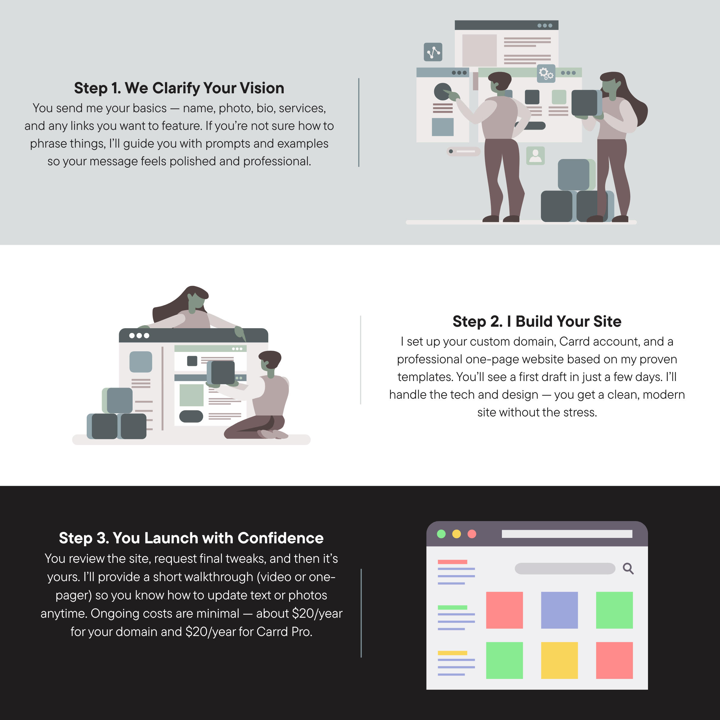 Most professionals need a website but don’t have the time (or desire) to figure out domains, web builders, and design tools. That’s where I come in. Online Profile Design is a simple service where I set up your professional homepage for you.Here’s how it works: